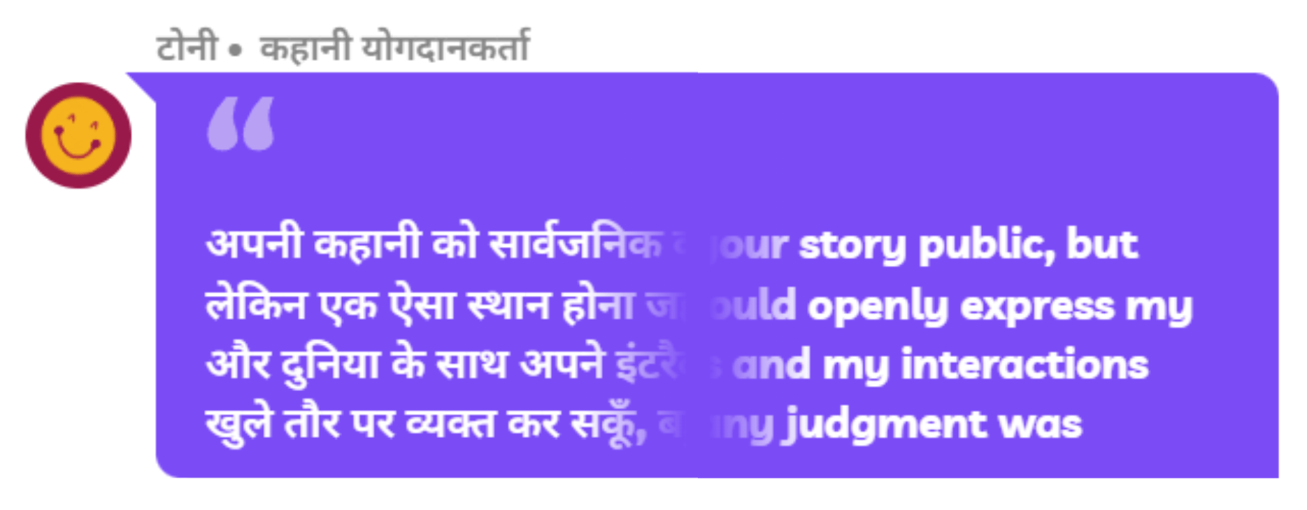IOTT conforms to i8n guidelines for multilingual web development. Each component, be it a button, placeholder, or story section, is available in Hindi and English.
